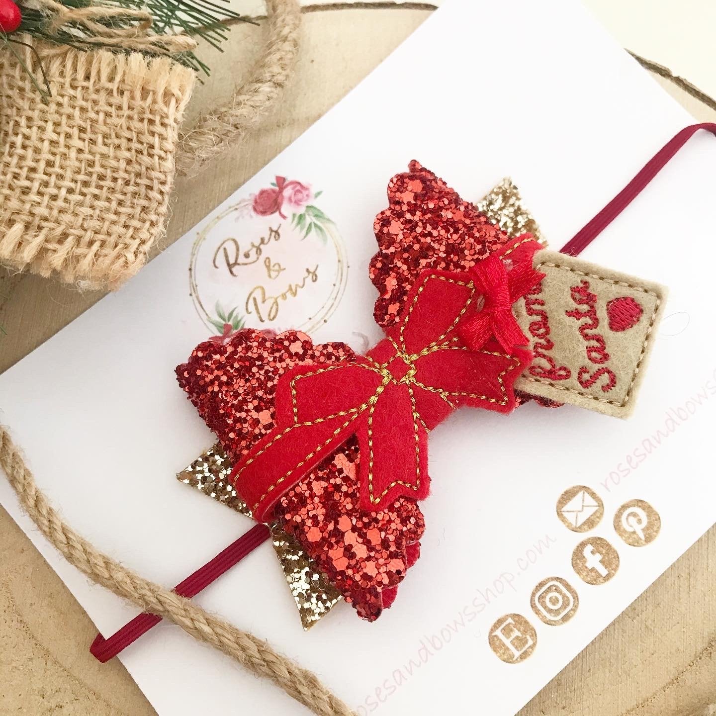 Made with glitter fabric and embroidered felt. Finished with a tiny red satin bow.