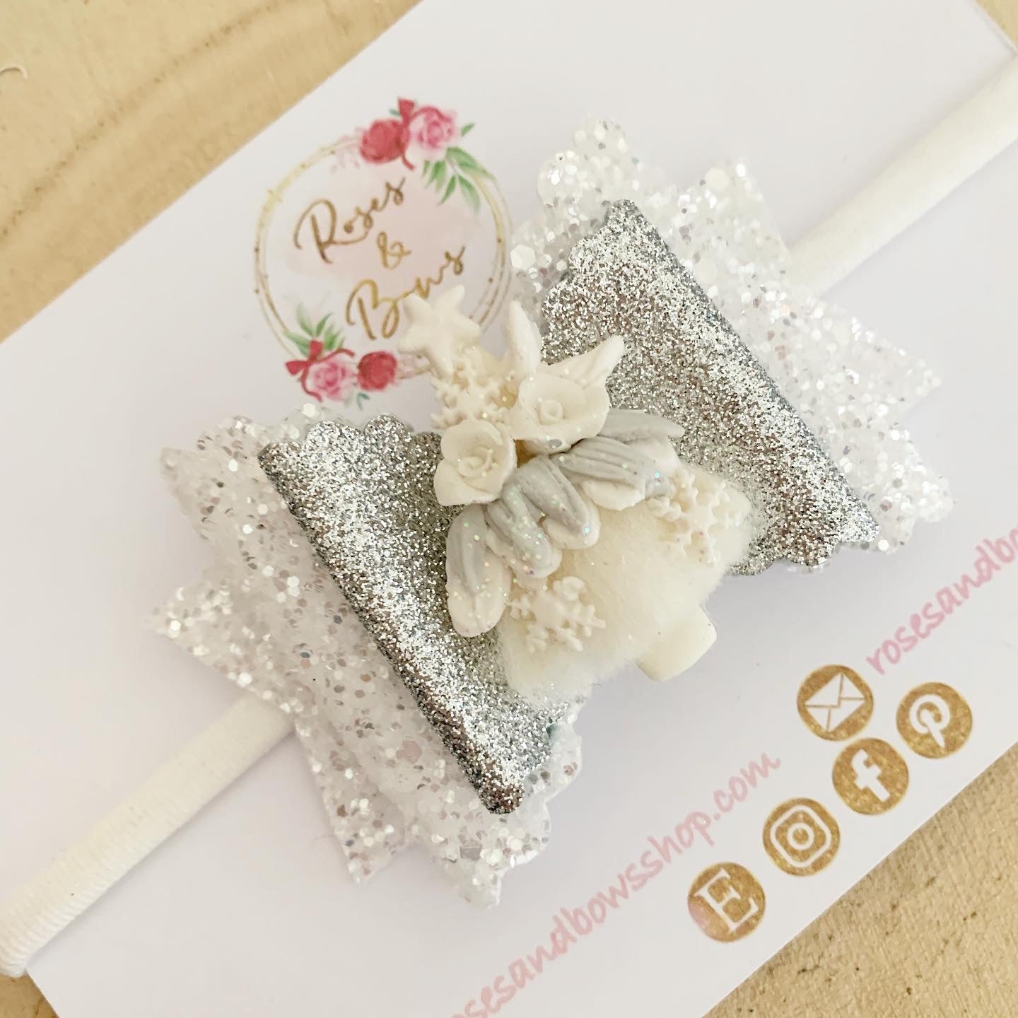 Handmade white & Silver Christmas Tree Glitter Hair Bow