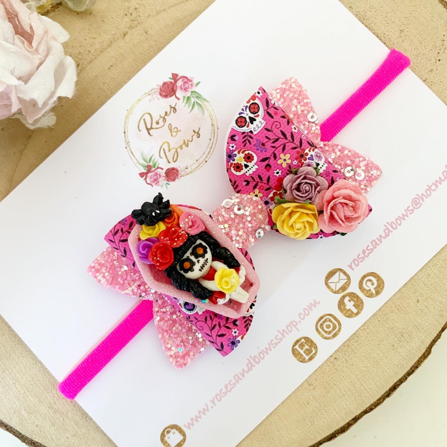 Made with glitter fabric, canvas backed with felt, mulberry paper flowers and a clay charm.