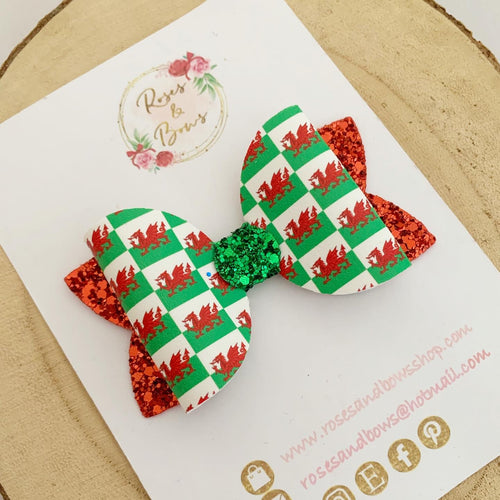 Welsh Flag St David’s Day Leatherette and Glitter Bow Headband or Clip