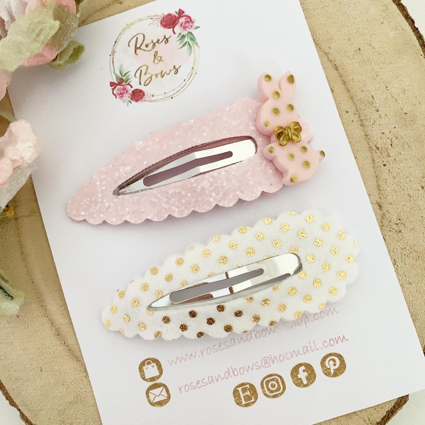 Made from glitter fabric and metallic felt and backed with soft 100% wool felt. Finished with a clay charm.