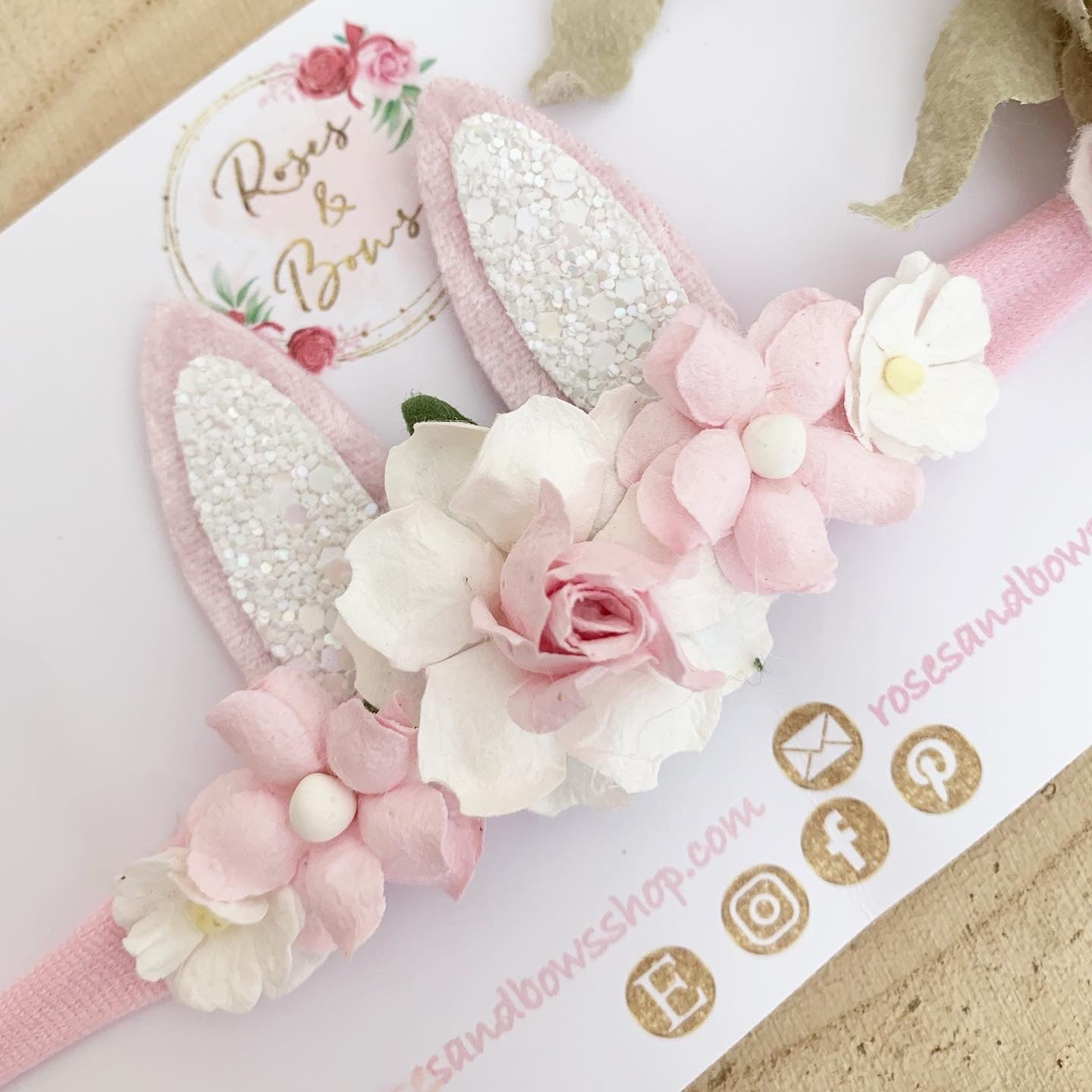 The ears are made from velvet fabric and chunky glitter fabric and the headbands is finished with delicate mulberry flowers attached to a super soft nylon band.